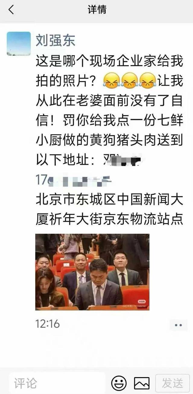 随即,刘强东在朋友圈发文调侃:“这是哪个现场企业家给我拍的照片?让我从此在老婆面前没有了自信!罚你给我点一份七鲜小厨做的黄狗猪头肉。”马上,关于#刘强东从此在老婆面前没有了自信# 的话题冲上微博热搜。