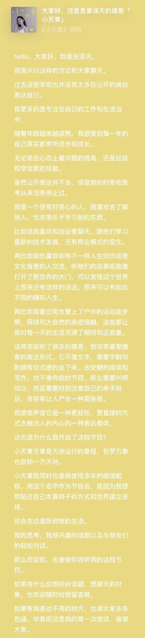 新年伊始,奶茶妹妹章泽天亲自下场做播客,开小红书账号运营。近日其在播客平台小宇宙平台开通个人账号,并取名“小天章”,首期节目是时长不到3分钟的自我介绍,节目播出1小时,收听量已破万。