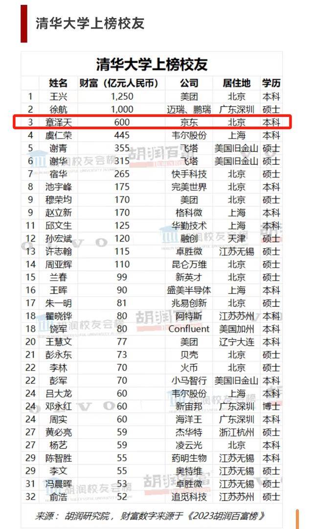 2024年,胡润研究院发布《胡润校友会榜》,在校友会榜中,在清华大学上榜校友的名单中,章泽天在列,以净资产600亿的身家在清华优秀校友中排行第三。
