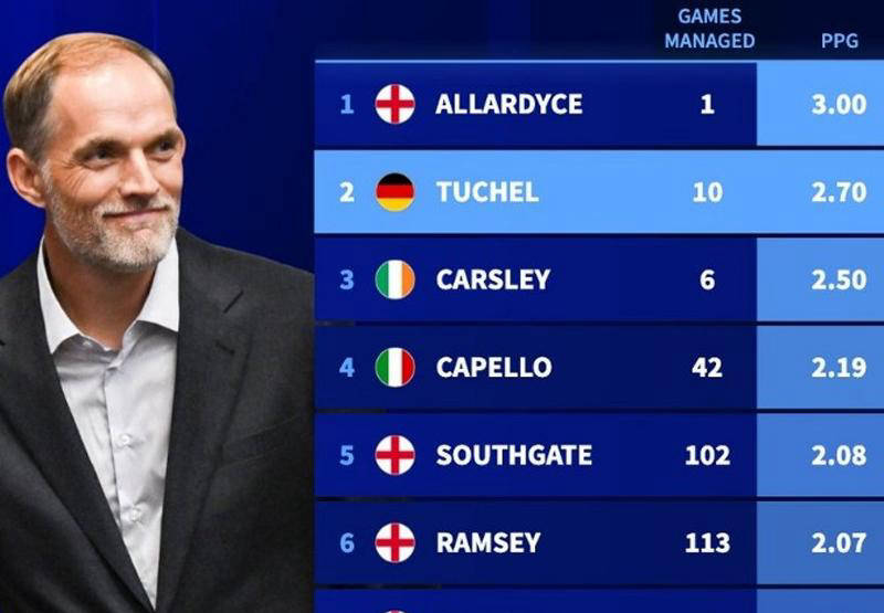 自去年初接替李·卡斯利担任英格兰主教练以来,图赫尔带领球队表现出色。在世界杯预选赛中,英格兰豪取八连胜且8场比赛零失球,提前两轮锁定晋级资格,成为唯一达成此成就的欧洲球队。此外,球队还保持着过去五届世界杯预选赛连续39场不败的惊人纪录。包括友谊赛在内的10场比赛,英格兰取得9胜,仅有一次不敌塞内加尔,同时这也是唯一丢球的比赛。数据表明,图赫尔场均积分达到2.7分,是英格兰所有主帅中成绩仅次于因特殊原因短暂执教的阿勒代斯,远超多位名帅如卡佩罗和索斯盖特。