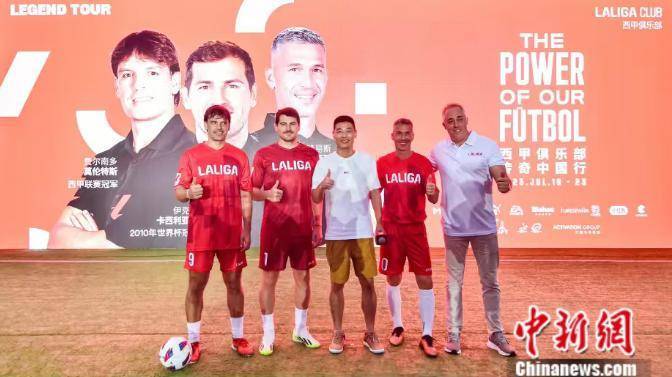 2023年7月,西甲联盟举行“西甲俱乐部传奇中国行”活动。图为三位西甲大使卡西利亚斯、莫伦特斯和路易斯·加西亚与中超球星武磊在上海参加足球嘉年华活动。 西甲联盟供图
