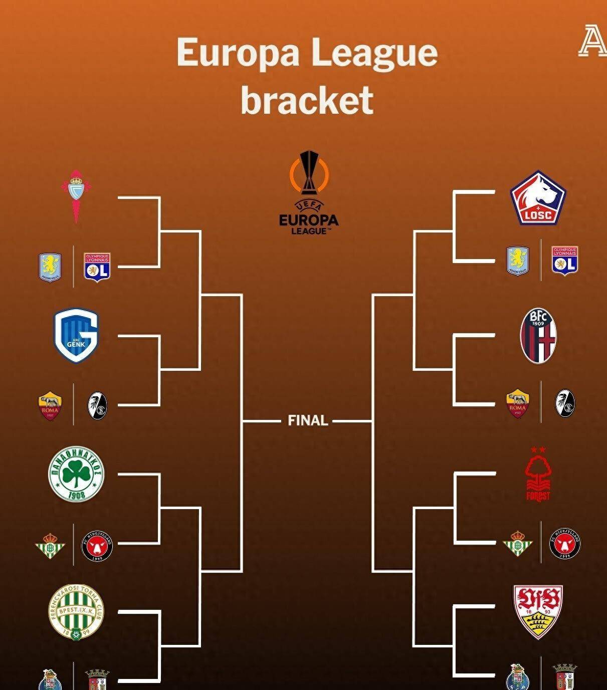 如果贝蒂斯抽中诺丁汉森林,1/8决赛最多能够产生四组五大联赛内战。 里昂和阿斯顿维拉两支种子球队将在本轮对阵塞尔塔或里尔两支同样来自五大联赛的对手。 博洛尼亚也将和同样来自五大联赛的球队展开对阵。