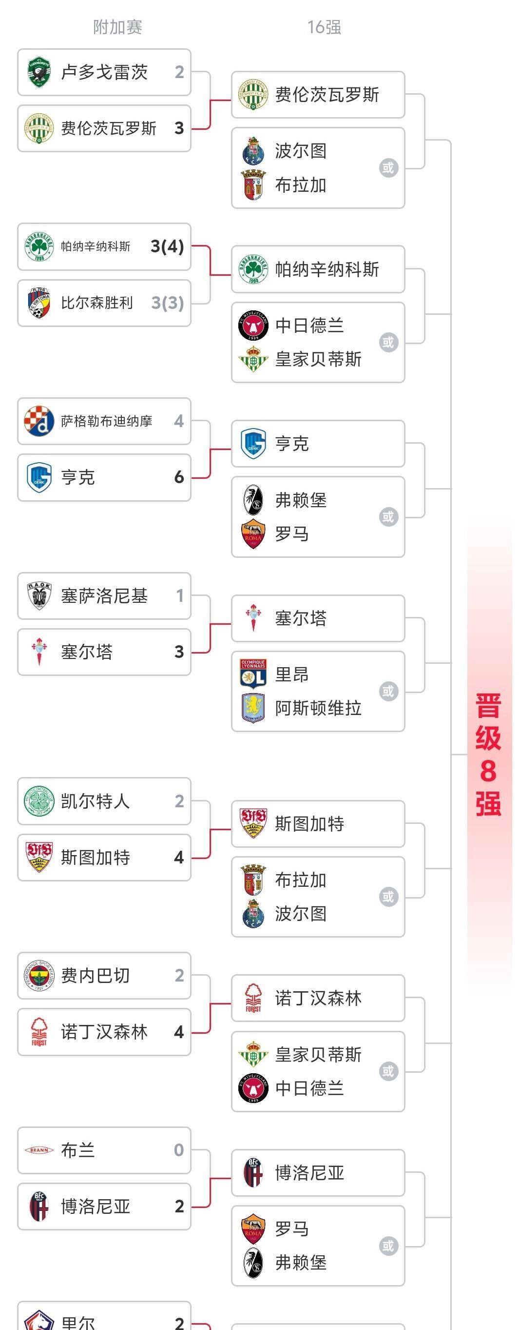 根据现有的分组规则,16强潜在对阵已经浮出水面。 第一组是费伦茨瓦罗斯或斯图加特对阵波尔图或布拉加。 第二组是帕纳辛纳科斯或诺丁汉森林对阵中日德兰或皇家贝蒂斯。