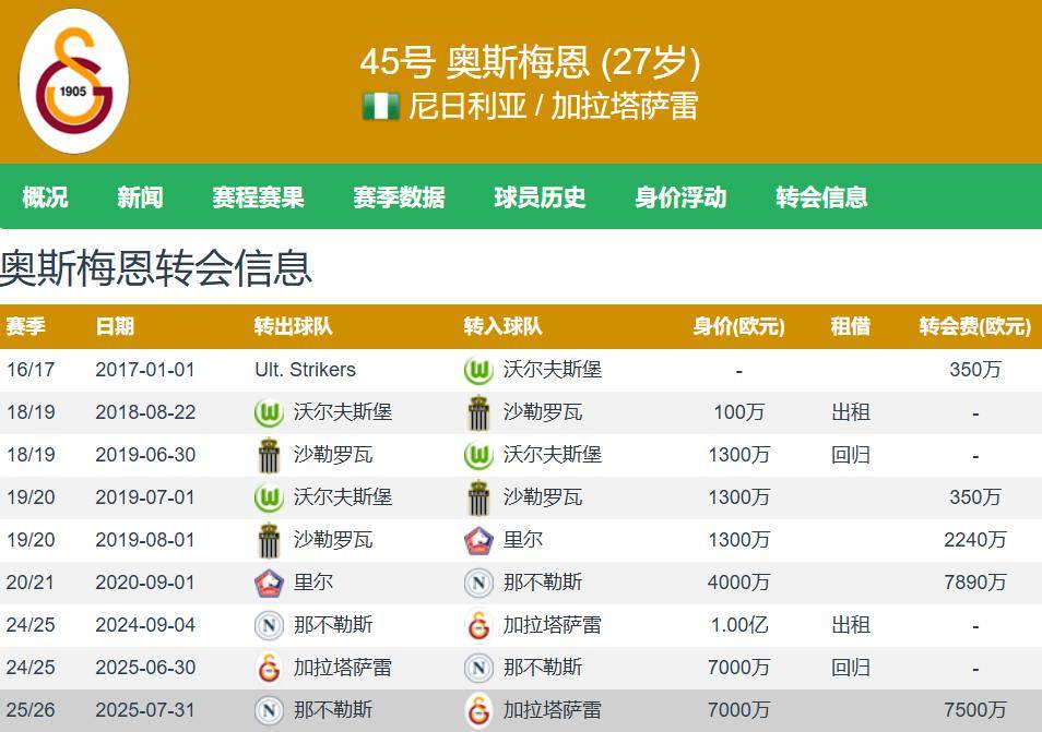 五大联赛,五大联赛直播,英超直播,西甲赛程,意甲比分,德甲预测,法甲分析/全网最全五大联赛资讯平台,涵盖英超、西甲、德甲、意甲、法甲直播入口、赛程积分、实时比分与专家预测分析,手机电脑均可访问!你渴望获得更高的工资吗?人之常情,球员踢球就是工作,还是青春饭的工作,因此球员想要获得更高的收入完全可以理解。高薪球员,拿钱办事,这就是好球星,前意甲金靴奥斯梅恩就是这样的球员。