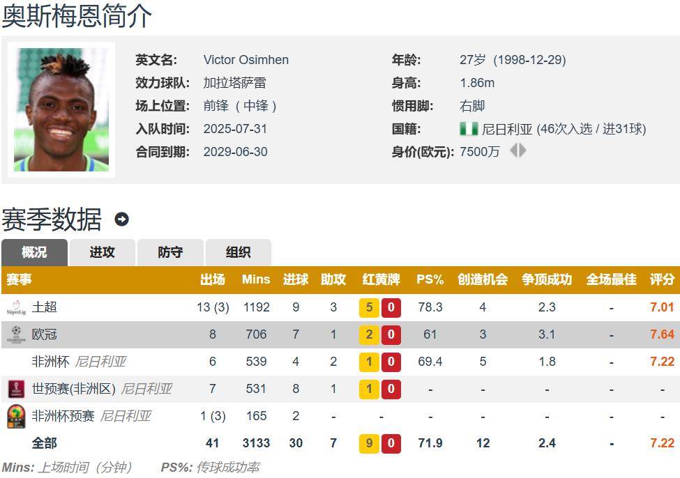 奥斯梅恩7500万欧元转会费加盟加拉塔萨雷之后真是拿钱办事,本赛季在欧冠赛场8场7球1助,场均参与1球,在欧冠射手榜上排名第五。奥斯梅恩未能继续在五大联赛效力,但也能在土超球队发光发热,欧冠赛场就是非五大联赛球员的最佳舞台,如今奥斯梅恩率领加拉塔萨雷晋级欧冠16强,1/8决赛将对阵英超球队,利物浦和热刺二选一。返回搜狐,查看更多